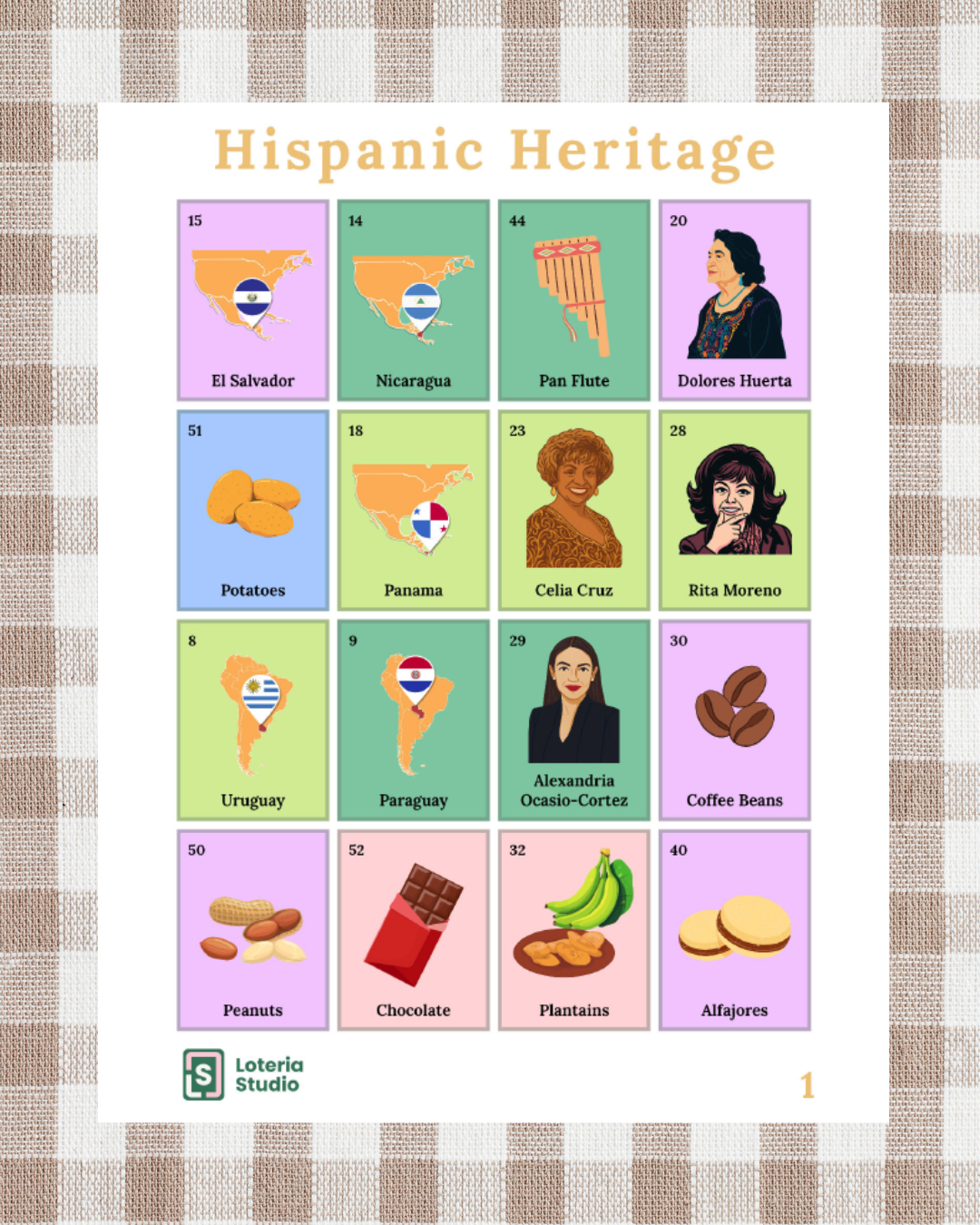 This lotería celebrates influential people, symbols, and icons from Hispanic countries such as Mexico, Honduras, Chile, and more. It’s a meaningful way to honor culture and history during Hispanic Heritage Month and beyond.