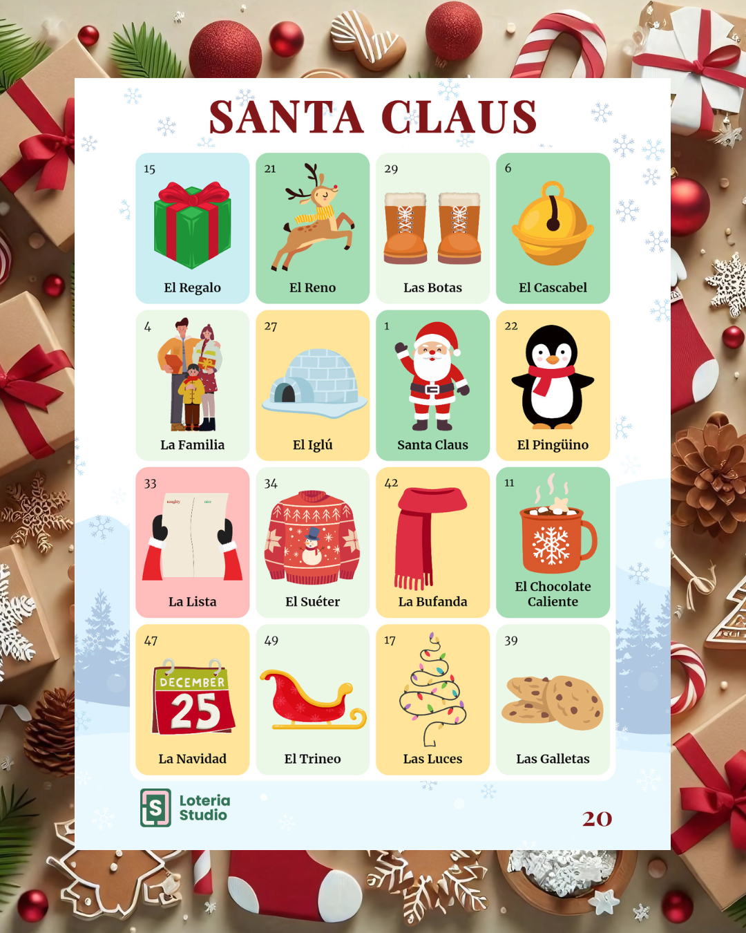 This adorable lotería features classic Christmas elements centered around Santa. It’s a fun option for holiday parties, classrooms, and cozy family game nights.